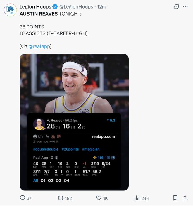 湖人官方发了一个奥斯汀-里夫斯的名字。