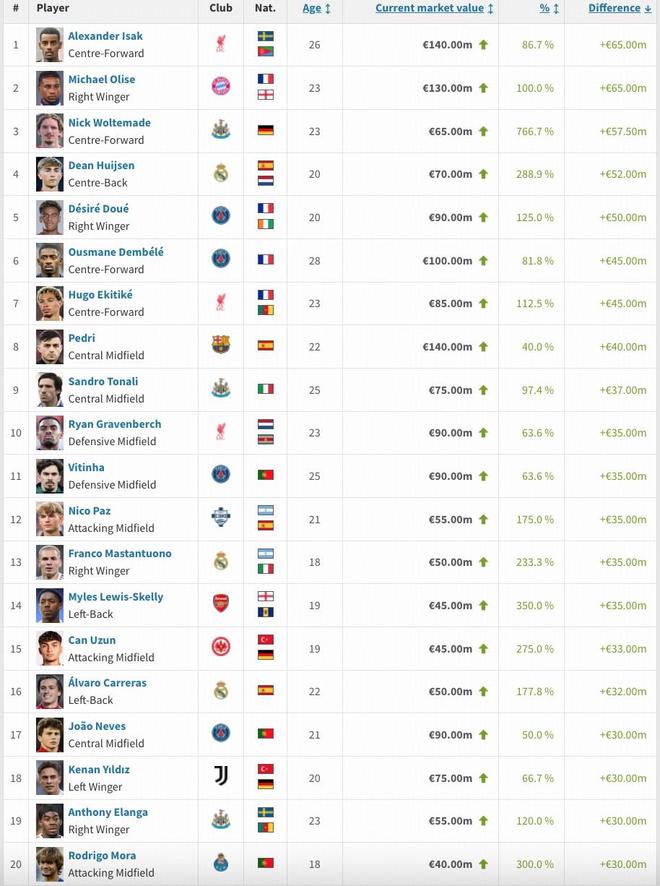 2025年身价上涨榜:伊萨克奥利塞飙升6500万欧,登贝莱涨4500万欧